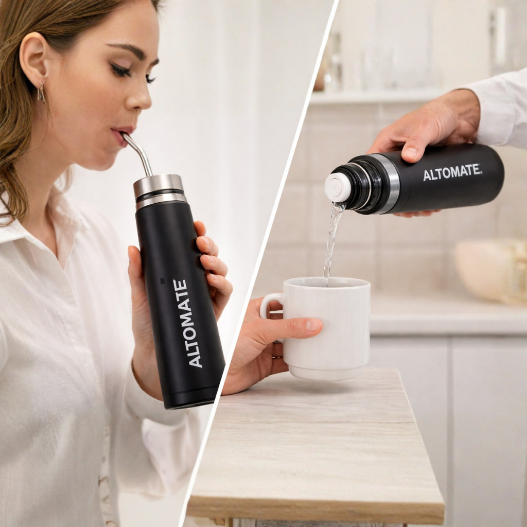 ALTO MATE®️ tiene dos formas de uso en un solo termo: como mate autocebante o como termo tradicional para mantener el agua caliente.